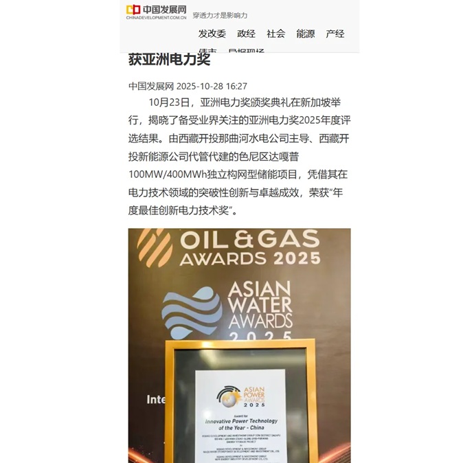 媒體報道丨色尼區(qū)達(dá)嘎普獨立構(gòu)網(wǎng)型儲能項目榮獲亞洲電力獎