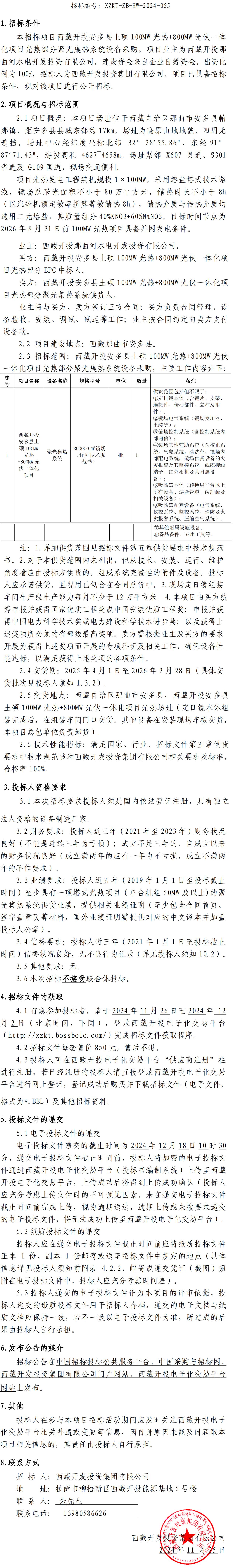 西藏開投安多縣土碩 100MW 光熱+800MW光伏一體化項目光熱部分聚光集熱系統(tǒng)設備采購招標公告