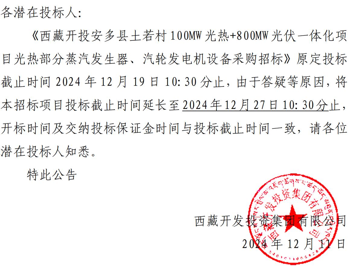 關(guān)于延長《西藏開投安多縣土碩 100MW 光熱+800MW 光伏一 體化項(xiàng)目光熱部分蒸汽發(fā)生器、汽輪發(fā)電機(jī)設(shè)備采購招標(biāo)》投 標(biāo)截止時(shí)間的公告