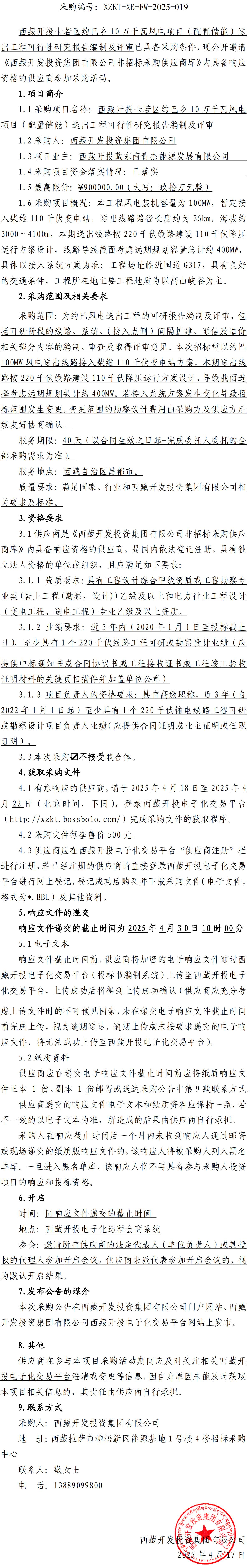 西藏開投卡若區(qū)約巴鄉(xiāng)10萬(wàn)千瓦風(fēng)電項(xiàng)目(配置儲(chǔ)能)送出工程可行性研究報(bào)告編制及評(píng)審詢比采購(gòu)公告
